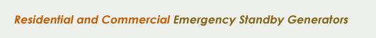 | Residential and commercial emergency standby generators are permanently installed outside your home (similar to an air-conditioning unit), supply electrical power to all pre-selected lights and appliances, and are powered by either natural gas or liquid propane. Models range from 7,000 to 150,000 watts. |